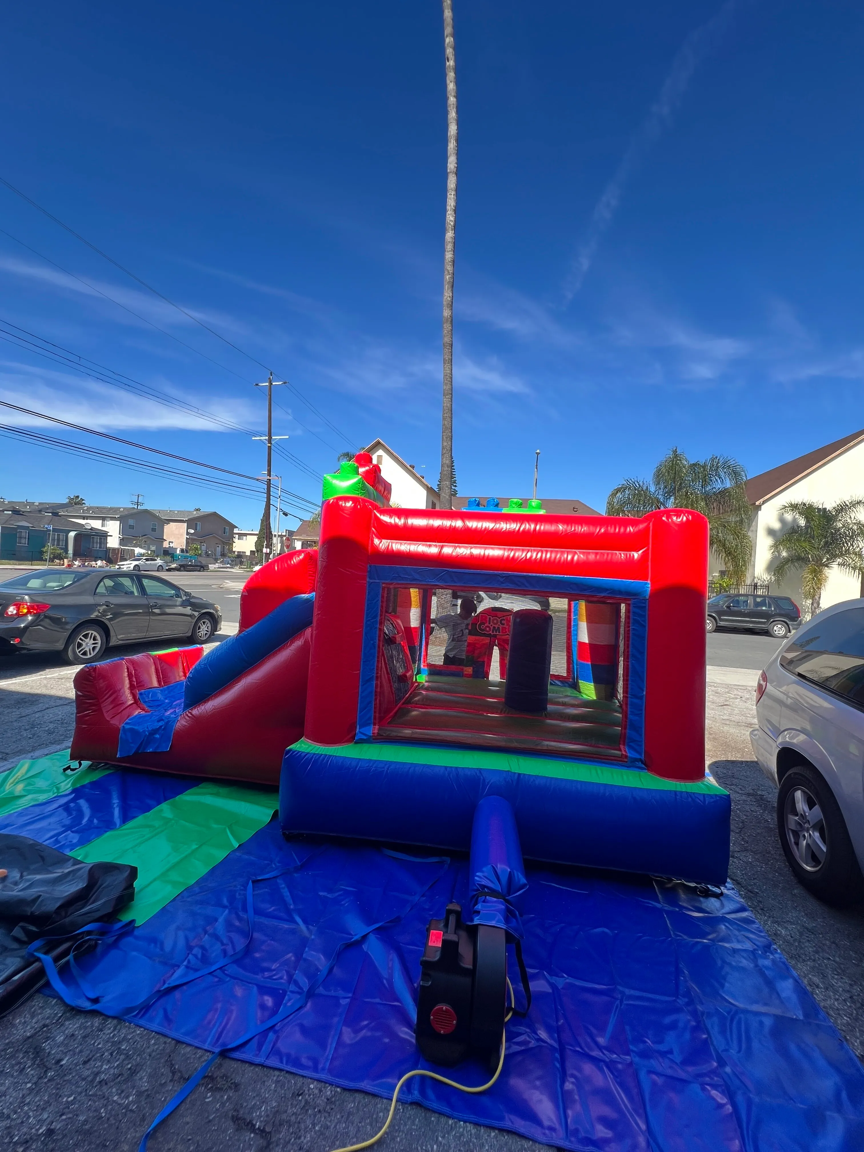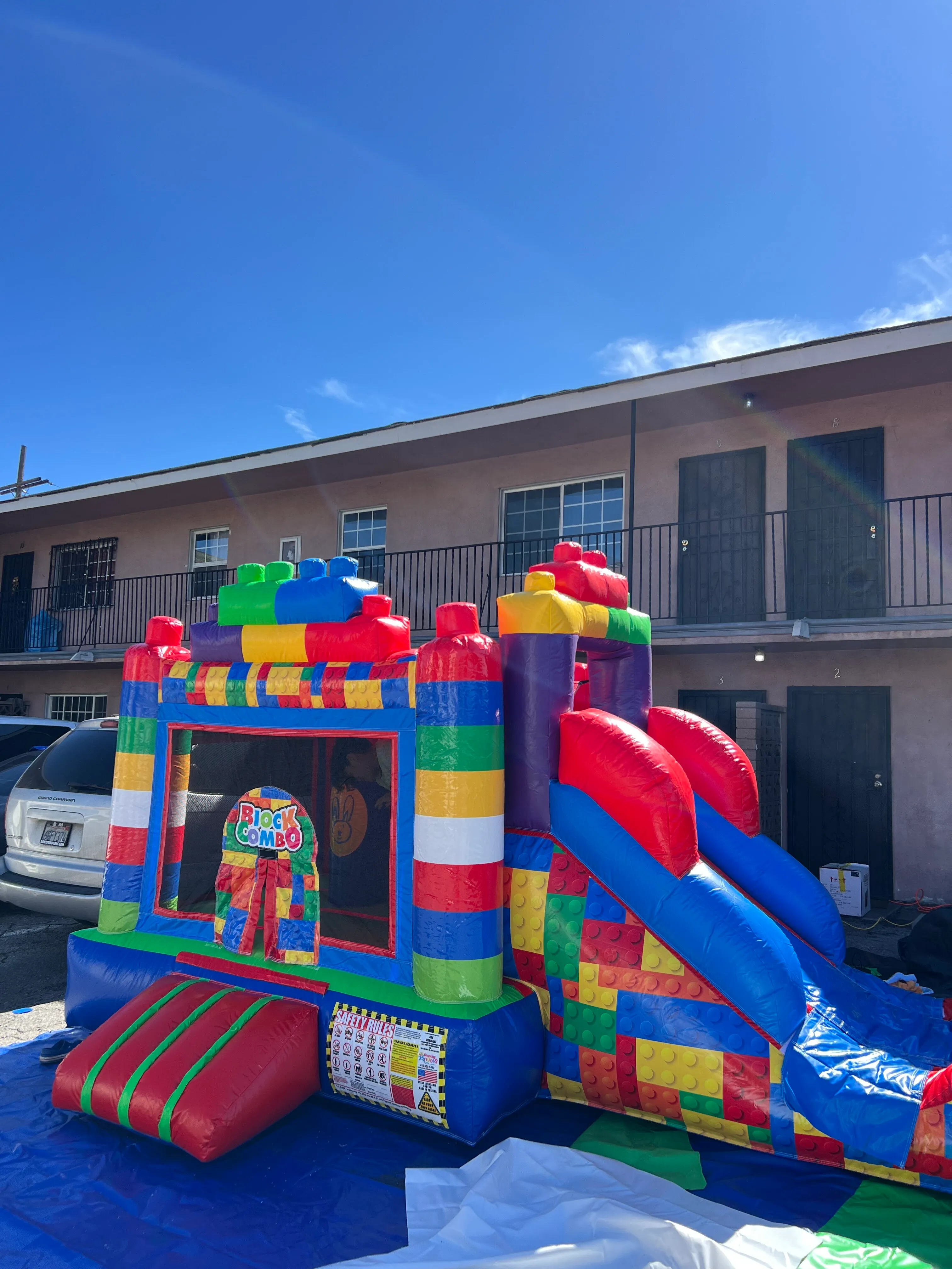 The Mini Toddlers Block Party Combo is a delightful play set designed to spark creativity and imagination in many of the young toddlers that would want to hop on this jumper, This comes with a slide even a red covering for when that hot Californian sun hits making the experience for your kids way better overall.
