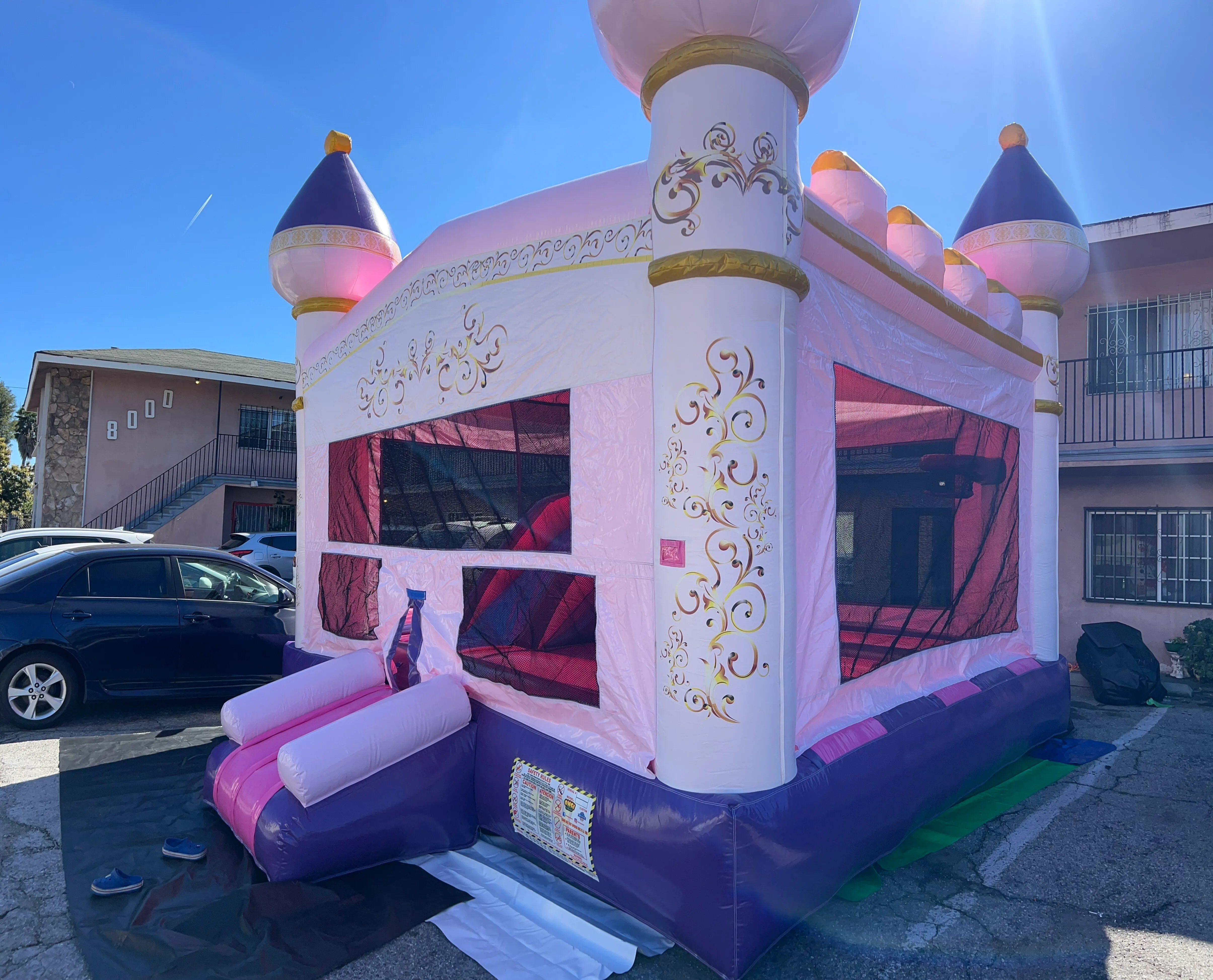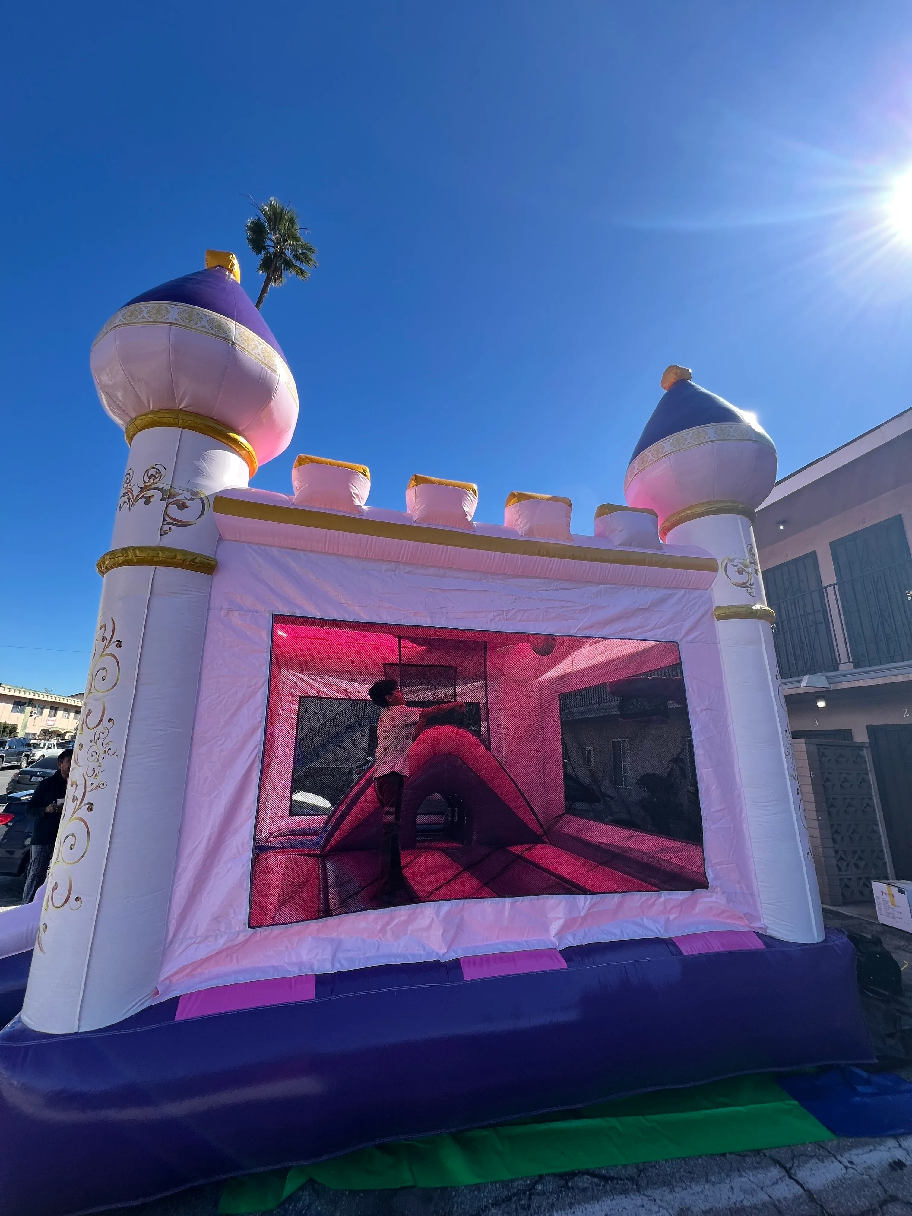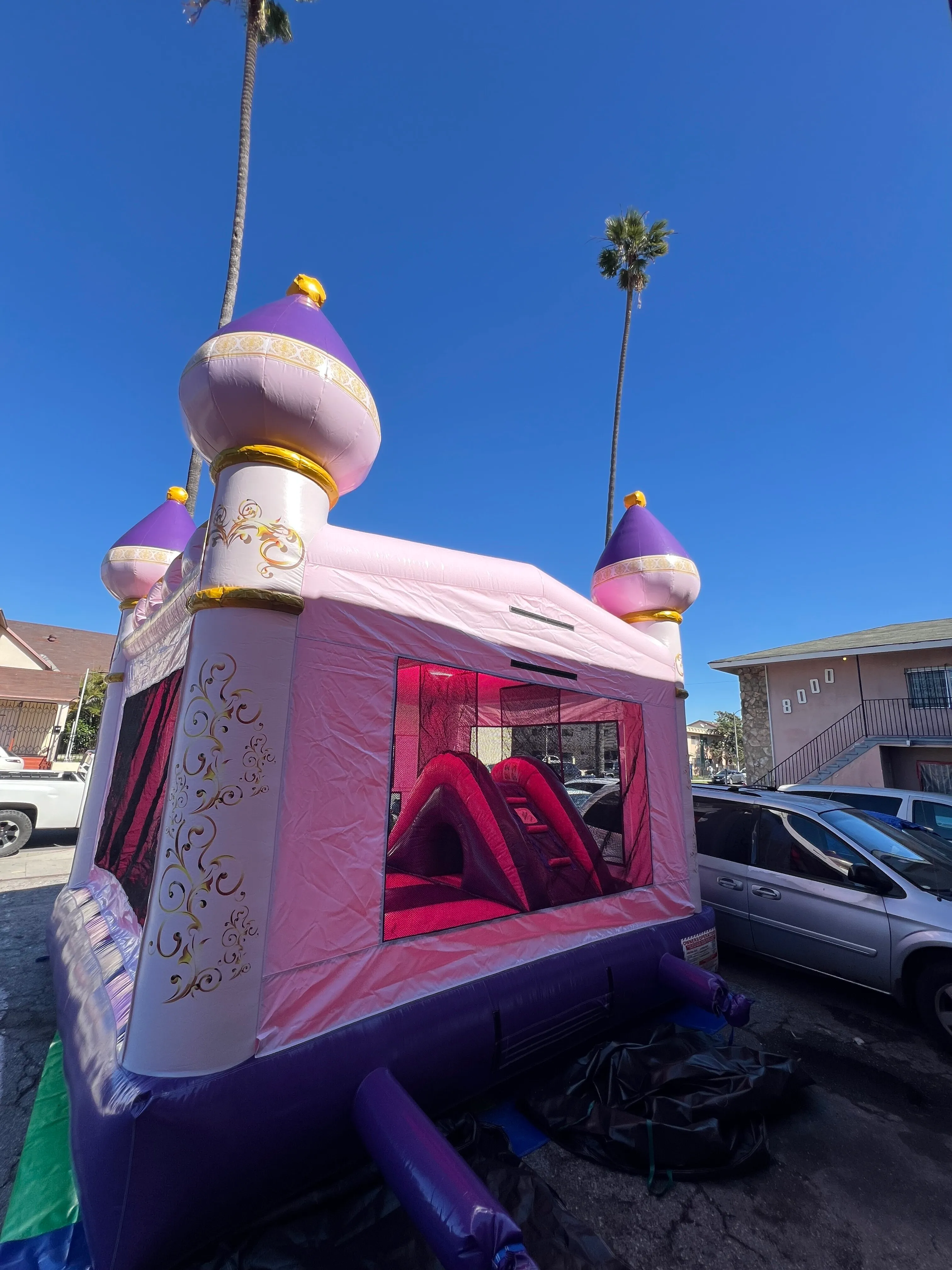 A pink and purple castle with elegant gold accents, the Royal Blush Palace Combo features a spacious bounce area plus an exciting interior slide for double the fun. Perfect for princess parties and magical birthdays, it’s fit for little royalty ready to jump and slide the day away! ✨🎉💜